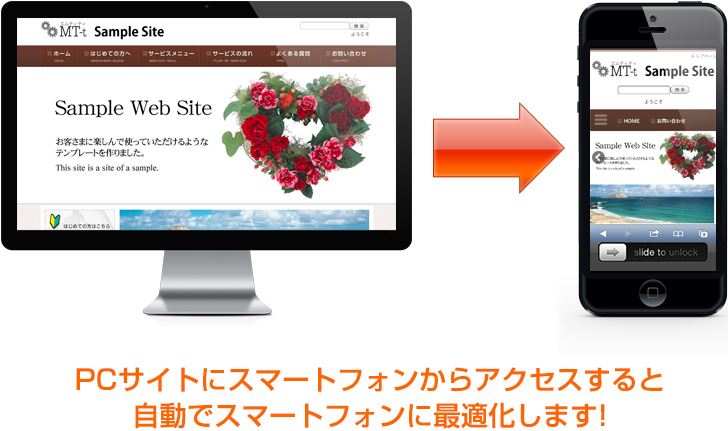 PCサイトがスマートフォンに自動最適化するようになりますので、アクセスデバイスを選ばずに反応の高いホームページを表示できます。